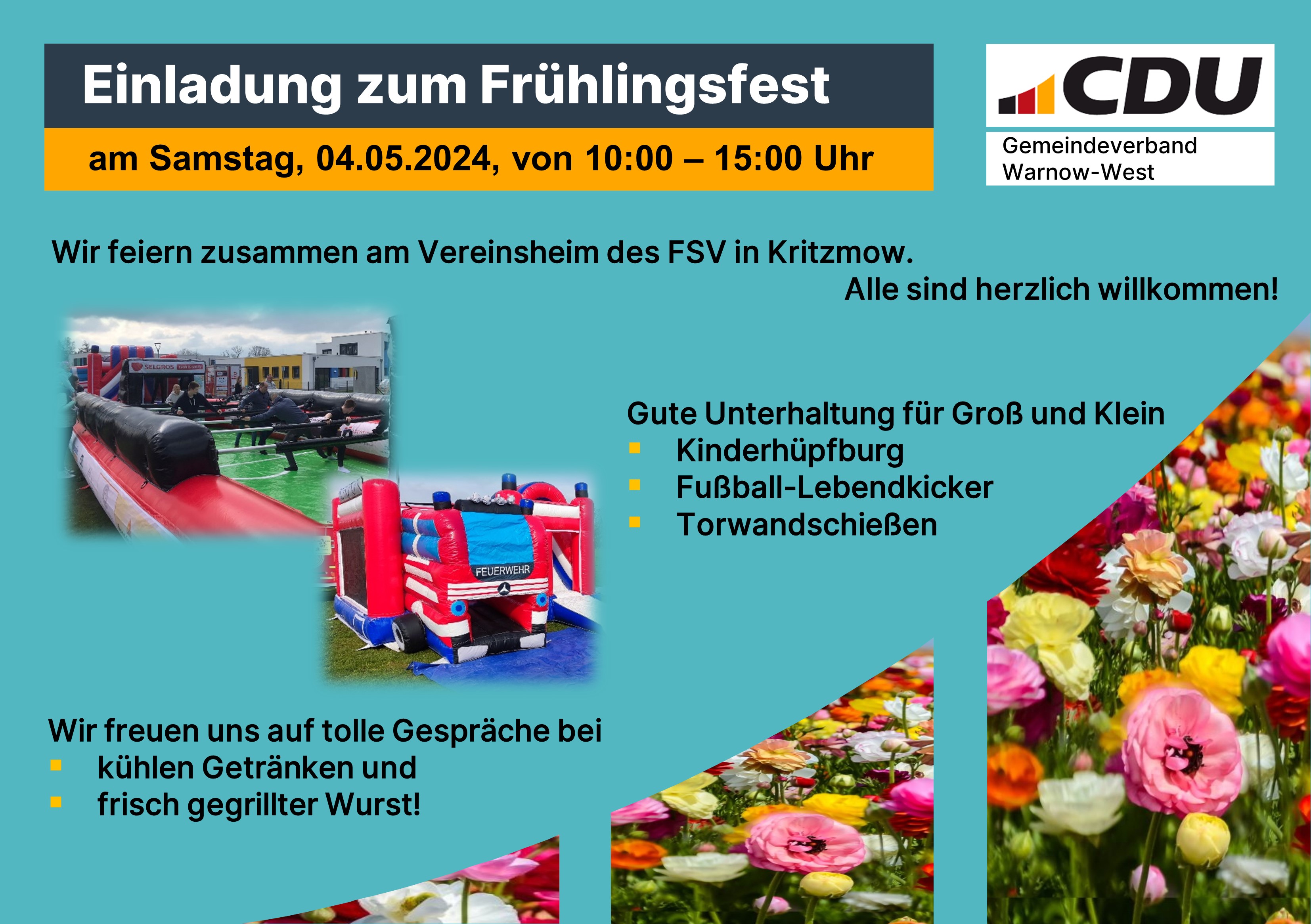 wir freuen uns, Sie und Ihre Familien zu unserem diesjährigen Frühlingsfest einzuladen! Feiern Sie mit uns am Samstag, den 04.05.24, von 10:00 bis 15:00 Uhr am Vereinsheim des FSV Kritzmow.